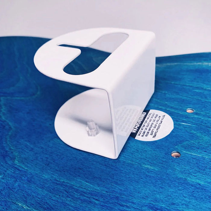 Skateboard wall hanging system. Brand: Tigerclaw. Sleek design, invisible once installed. Material: metal and transparent screws.